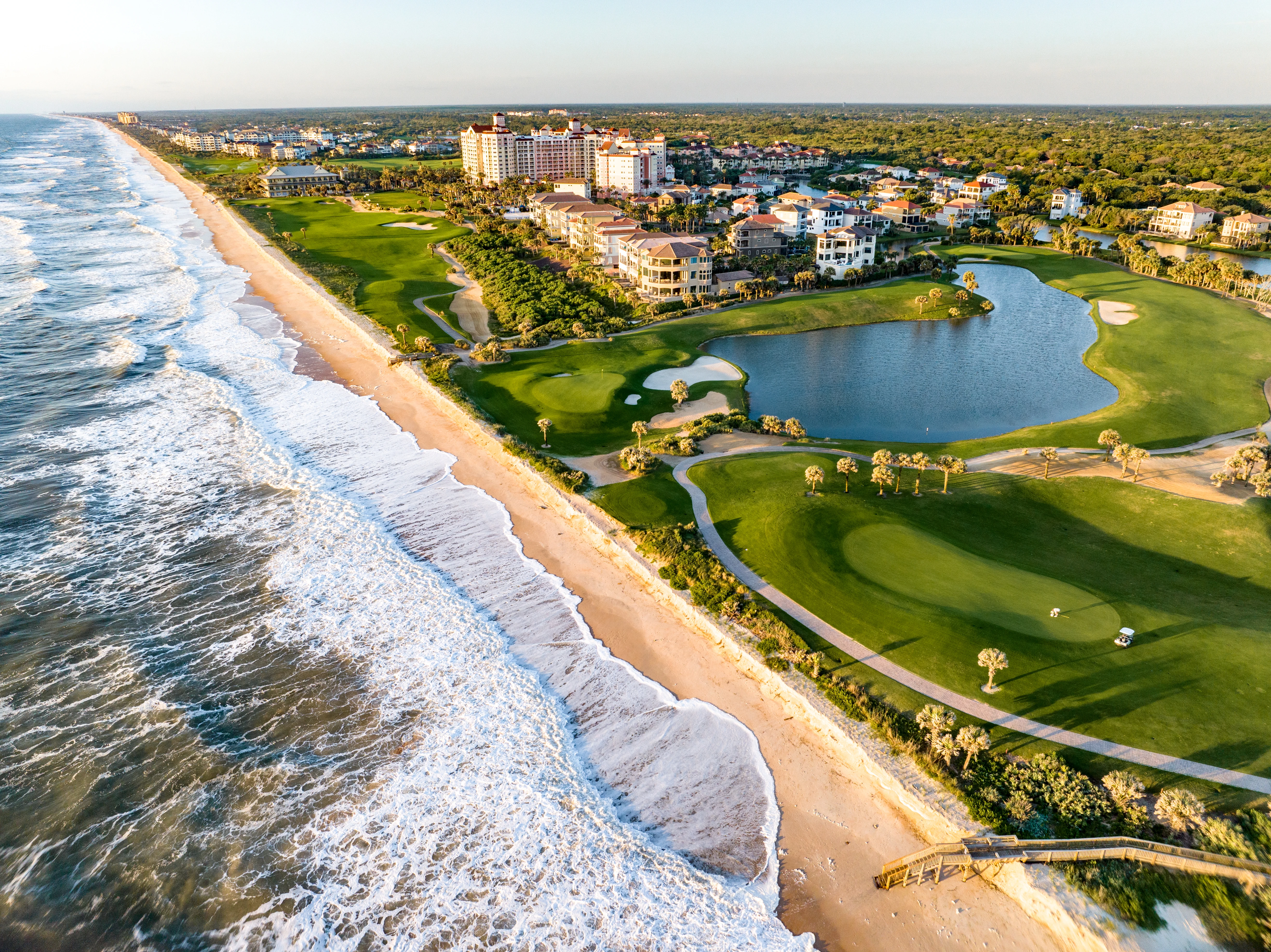 Instead of staying in the Daytona area after landing at DAB, hop in an Uber or rent a car to drive to Palm Coast, Florida. In just about 45 minutes, depending on traffic, you’ll arrive at your base camp for your vacation: Hammock Beach Golf Resort & Spa. Not only does the property put you conveniently between the beach and downtown Palm Coast, but it also has two award-winning golf courses—one designed by Jack Nicklaus, the other by Tom Watson.