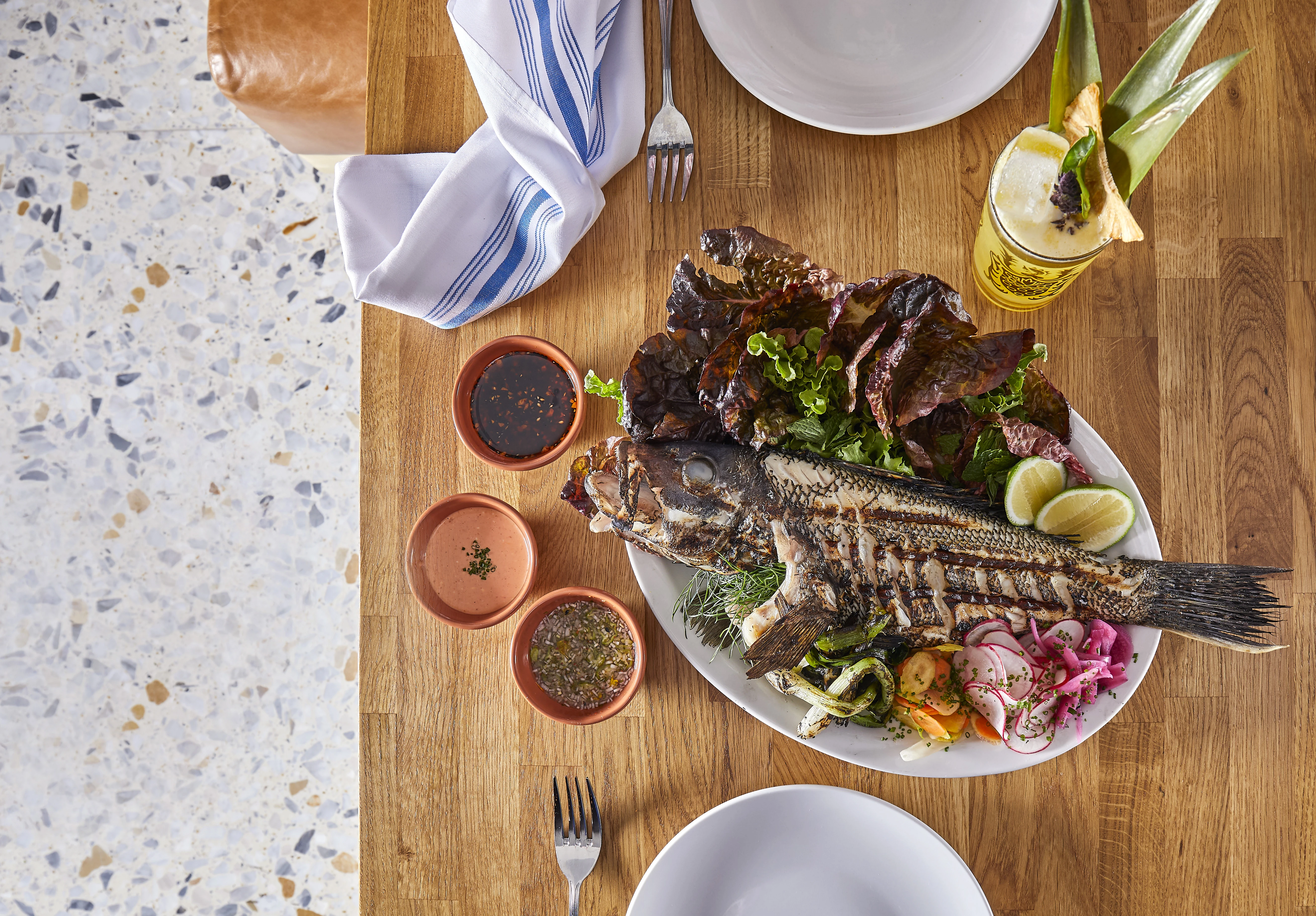 The roasted whole fish served with wild herbs, nuoc cham (a traditional Vietnamese dipping sauce), chili crisp, sticky rice, and local lettuces is at the top of my list. It’s my take on fish ssam, a Korean dish where diners wrap pieces of fish in lettuce with herbs and sauce. My favorite part is the presentation. It’s a larger plate meant to be shared, encouraging guests to interact with one another while they enjoy their meal. Because really, the best part of any meal is sharing it with the people we love.